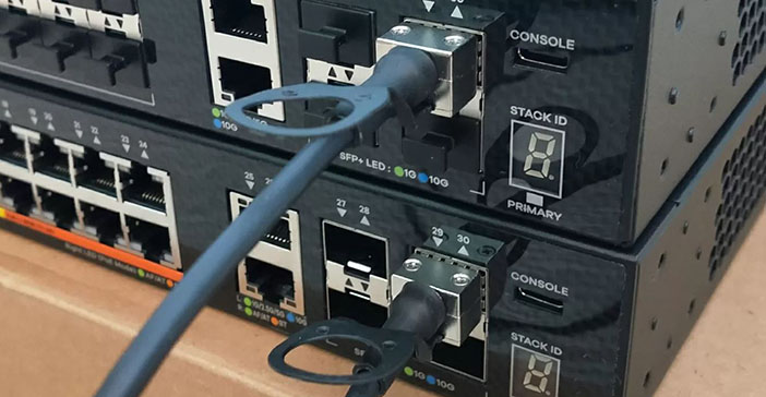 - با استفاده از کابلهای مخصوص استک که پهنای باند بالا و تاخیر کمی دارند، پورتهای استک به یکدیگر وصل میشوند. میتوان پورتهای SFP را با استفاده از کابل مسی DAC (ارزانتر) یا فیبر نوری (گرانتر، مناسب فاصلههای دورتر) به یکدیگر متصل کرد.